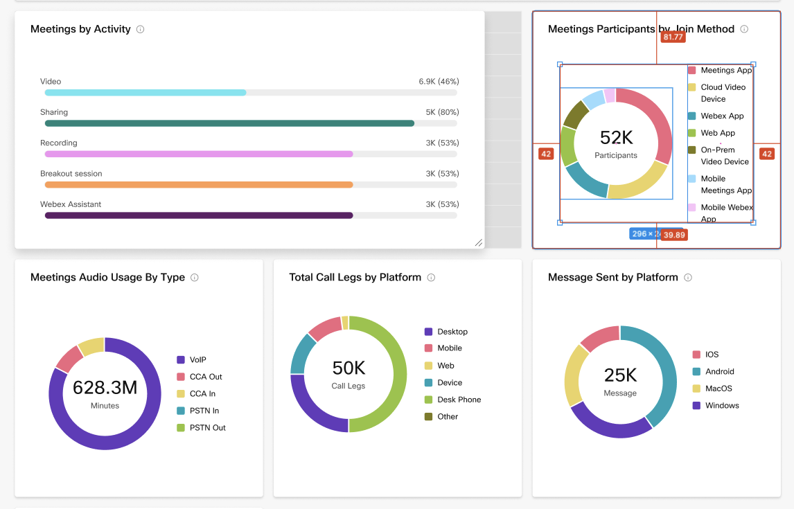 When I began working for Cisco in 2021, I was a product designer for the Webex Control Hub Analytics team. My primary assignment was to create, expand, and own a library of chart and graph components that the team could use consistently across products. Up to this point, there were UI designs for analytics pages, but charts were created manually, applied inconsistently, and required tedious and time-consuming work to update.