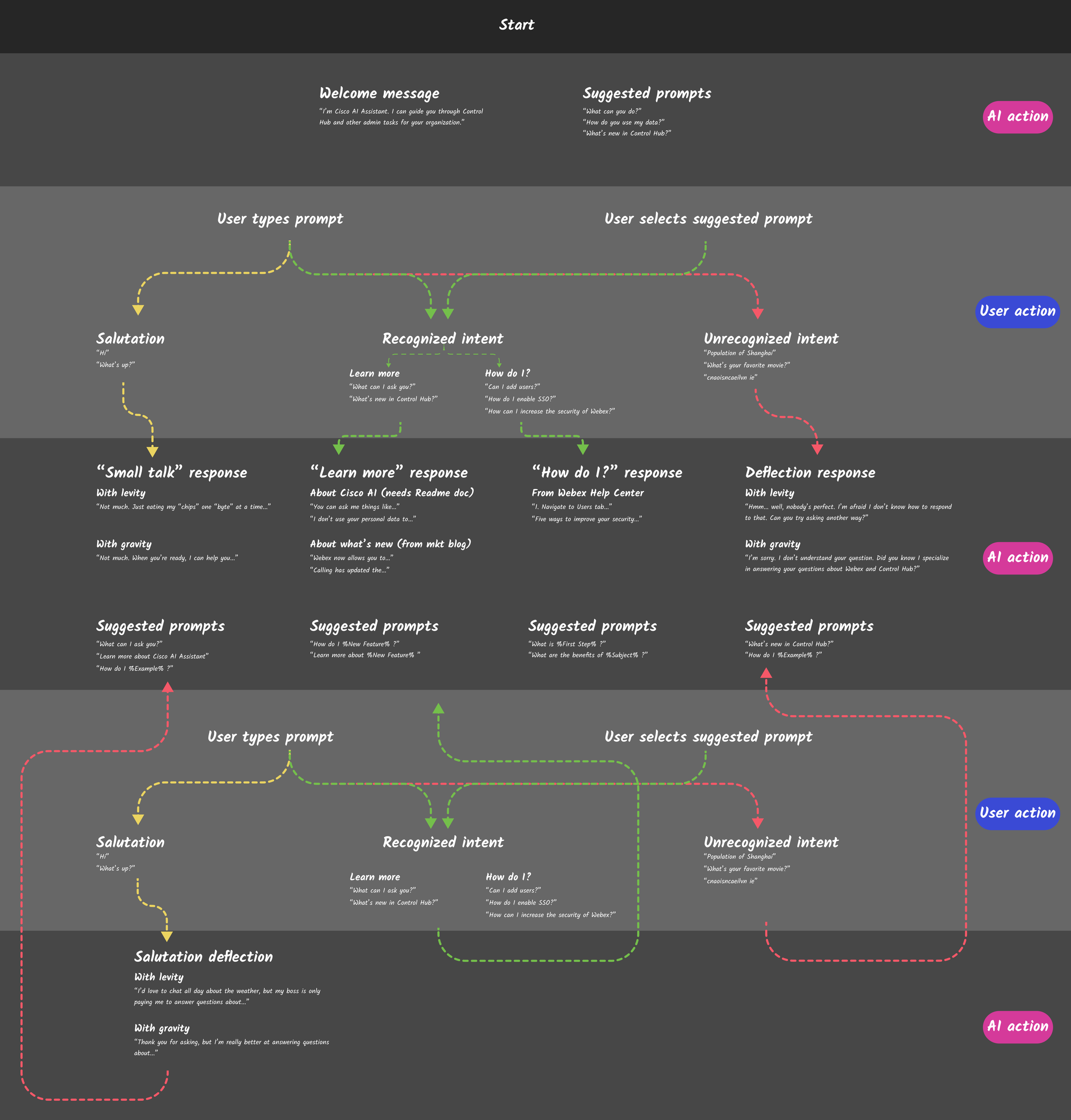 After studying some fundamentals of conversation modeling, I provided our engineering team with a flowchart to guide the Assistant’s prompt suggestions. These suggestions funneled conversations into our happy paths and steered away from corners where users could get stuck or confused.